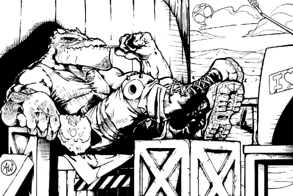 Background: Born to former soldiers of the Tolkeen War, after their defeat, his parents settled out West to enjoy the deserts at the edge of the Barrier Wall, beyond the reach of the Coalition, biding their time to rise again and join a resistance force. They stayed together, despite the wandering habit of males of their race, and had two litters of children; Teddy was born the youngest and smallest of all 7, and probably developed a bit of a complex about having to be the biggest and baddest around because of it. His parents tried to instill the same level of responsibility and self motivation in their son that they had grown accustomed to, especially with their new involvement with resistance groups, but even as several of his older siblings were motivated to do so, Ted firmly decided that it was his parents war, not his, and he was better off keeping his scales out of it. He moved at 17, and found the nearest town to squat in just waiting to hit paydirt on a scheme, plan, or any kind of job that would let him live on easy street rather than end up like his hard working (for Larmac) parents. He found work for a bar as bouncer, finding that his race and general size was rather rare in this tumbleweed country, and lives in a run down and downright messy apartment above the establishment where he brews his own alcohol for when the boss man cuts him off. Occasionally he busts troublemakers he overhears to the local law enforcement for a decent pile of credits or to be revered as a hero and get a nice flow of free booze, but sometimes he offers his muscle to the cause (loan sharks, petty theft, insurance fraud, etc.), looking for a quick and easy paycheck just for showing off and tossing his weight around.
