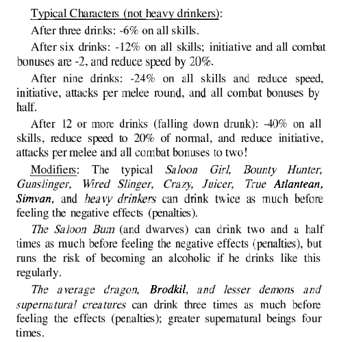 Insanity(s): Addiction: Alcohol (Personality While Intoxicated Table, Staggering Drunk Penalties, and Withdrawal Symptoms indicated in pages 338-339 of RUE.)