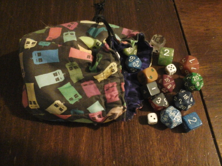 As for a product, I’d have to say my TARDIS-themed dice bag! It’s got rainbow TARDIS silhouettes and it’s reversible (the inside is a swirling vortex of stars!) Bought from Saving Throw Dice Bags on Etsy.