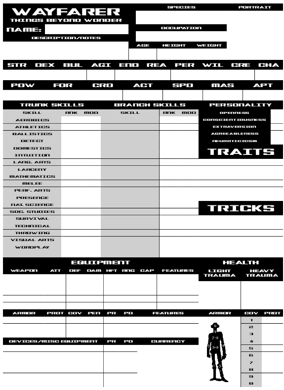 I’m super excited about both of them, obviously. Wolfen Empire has some great adventures and lots of in depth information to draw upon in regards to an entire planet of D-Bees. And Wayfarer is a brand new RPG with a very interesting (and optionally completely random) character creation system and rule set (plus the art is phenomenal.) Check out some basics on Wayfarer in a previous post.