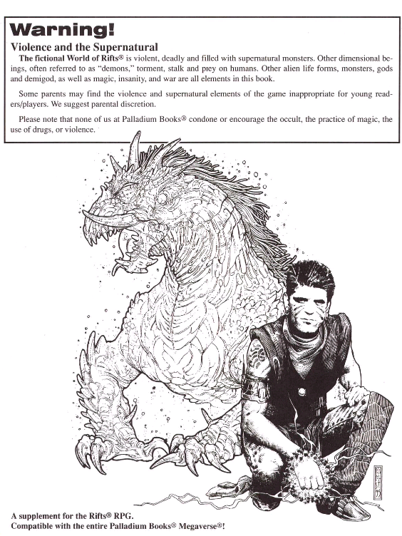 But I will have to say that Rifts and Palladium Fantasy could use some new, revised editions. The settings of Rifts are my favourites and the main reasons I play the game, but the culture and economics, the makeup of population and atmosphere, planet and ruin, it needs a real overhaul. Plus the supplements are invariably written from a white, male, American perspective, something you notice especially with the Rifts Africa book. It really just makes it feel quite stunted, and I think it probably pushes away or isolates a lot of potential players; so I’d call for a revised look at the culture and economics of the Multiverse, and also a long hard look at the ingrained (though undoubtedly unintentional) racism and sexism. Beyond the Supernatural could use some more love and new editions as well, that’s for sure!