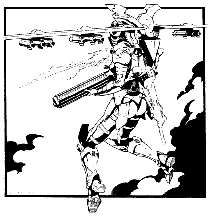 Weapons System: Forearm Rocket Launcher (2): Missile Types: Armour Piercing (1D4×10 M.D.), Plasma (1D6×10), or Fragmentation (5D6 M.D.), but can use any mini-missile. Effective Range: 1 mile. Rate of Fire: One or two simultaneously (both only count as one attack.) Payload: 2 per arm. Primary Purpose: Anti-aircraft and defense.