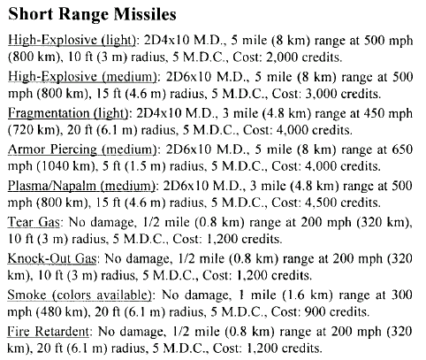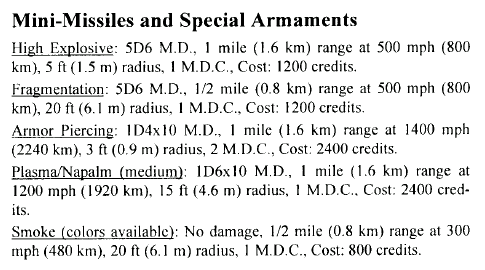 Weapons System: Wing Rockets Damage: Varies, see missiles below. Effective Range: Varies with missile type, 1-5 miles. Rate of Fire: May be fired singularly, or in volleys of 2, 3, or 4 (a volley counts as one melee attack regardless of the number of missiles laubched in the volley.) Payload: A total of either 12 mini-missiles or 6 short range missiles. Primary Purpose: Anti-aircraft/armoured vehicle.