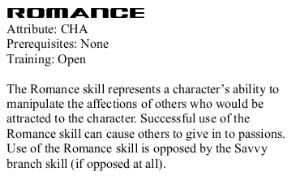 Wayfarer makes no mention of sexuality, though it is not completely absent, either. In the Wordplay skills section, “Romance” (pictured below) is made plainly indistinguishable of sex or gender (in fact, most of the text is free of gendered broad statements), enabling the player to play how they feel most comfortable. Gender differences in race descriptions are also not a prominent feature, and are quite open to interpretation by the DM or players.