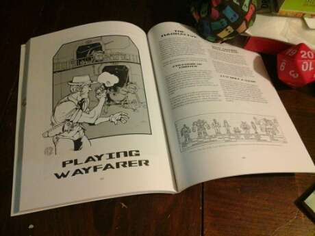 As I received both the physical and digital copy of Wayfarer through the original, succesful Kickstarter project, I was delighted to hold it in my hands just a few months after I had previously featured it, safely delived to me via media mail in a bubble envelope. The physical book is roughly the same size as your average role playing text, it stacks nicely beside my numerous Rifts books, and is composed of high quality paper and a tough paperback cover. The cover itself is in nearly pristine condition, the only error being that the barcode is very blurred and probably unusable (a printing error, it seems), and is very stark and set apart with its mostly black background. The text is clean and not smudged, no errors which I have found, and with very clear images, even in its black and white print. Oftentimes when I buy a new book, especially an RPG, it smells a bit like a newspaper for the sheer amount of ink pressed within, however, Wayfarer delightfully has none of that almost plastic odor.