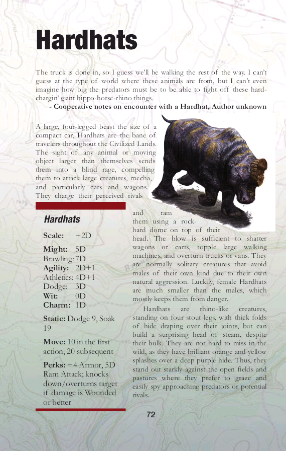 Gear: Weapon: Club (1D+1), Weapon: Medium Rifle (5D, 5 shots, 350ft range), Armour: Reinforced Leather (+3), Bumps x3, Shelter, Scope, Survival Kit, Water Purifier.